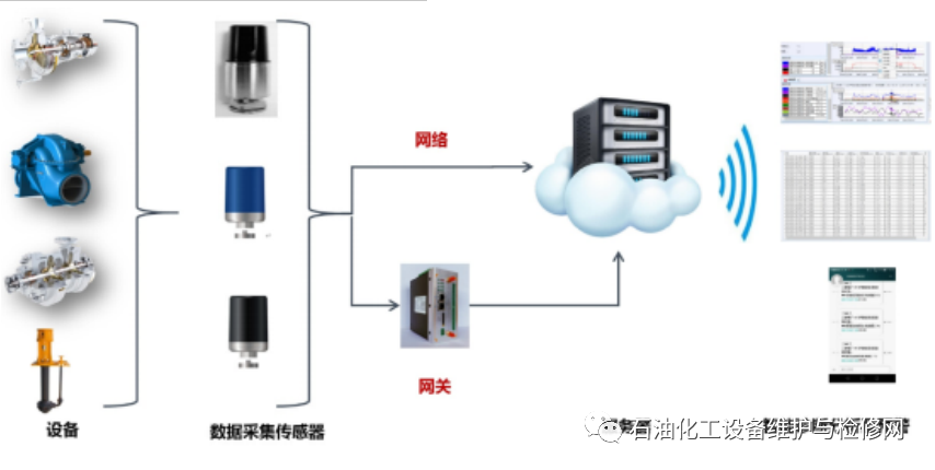 在機泵上安裝便攜式傳感器,用來采集相應(yīng)數(shù)據(jù)(如:軸承溫度、泵振動值等),傳感器可以采用有限或無線智能傳感器,近幾年無線傳感器技術(shù)已相對成熟,無線傳感器具有安裝便捷、快速等特點,結(jié)合設(shè)備的重要性和安裝條件,可以綜合考慮無線傳感器與有線傳感器來實現(xiàn)數(shù)據(jù)采集。