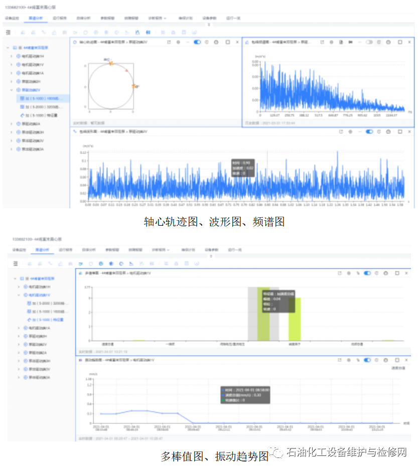 對采集的數(shù)據(jù)(軸承溫度、泵振動等)進(jìn)行分析,得到變化圖譜,以振動為例,主要對收集的數(shù)據(jù)進(jìn)一步轉(zhuǎn)化成波形圖和頻譜圖進(jìn)行分析,得到具體引起振動的原因,有針對性的提前采取預(yù)防措施。