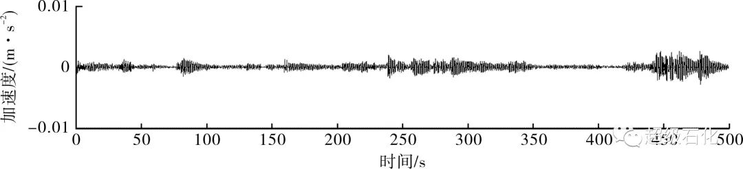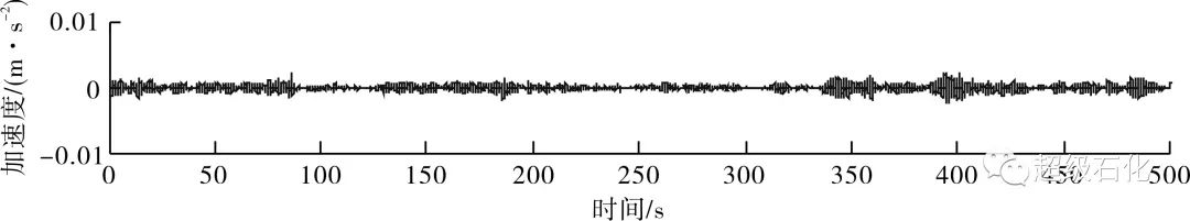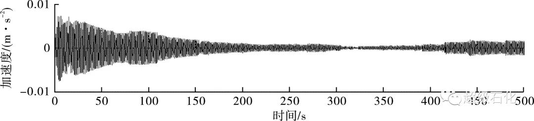 分析圖3~圖5可以得出,調質阻尼器鎖死與釋放時,脫硫洗滌塔順風向測點在500 s內的振動加速度峰值分別為0.007 283 m/s2和0.002 618 m/s2。按照振動加速度峰值計算的調質阻尼器減振效率為64.1%。調質阻尼器釋放后,脫硫洗滌塔結構阻尼比提高至3.66%。調質阻尼器鎖死與釋放條件下脫硫洗滌塔橫風向測點振動加速度時程見圖6和圖7,