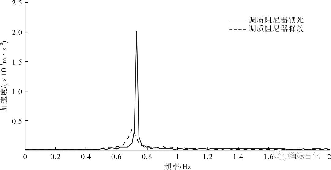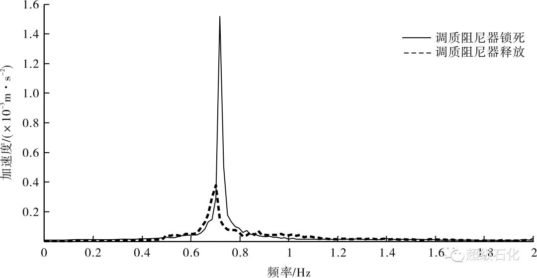 分析圖6~圖8可以得出,調質阻尼器鎖死與釋放時,橫風向脫硫洗滌塔在500 s內振動加速度峰值分別為0.009 812 m/s2和0.002 360 m/s2。按振動加速度峰值計算的調質阻尼器減振效率為76.5%。調質阻尼器釋放后,脫硫洗滌塔結構阻尼比提高至3.51%。