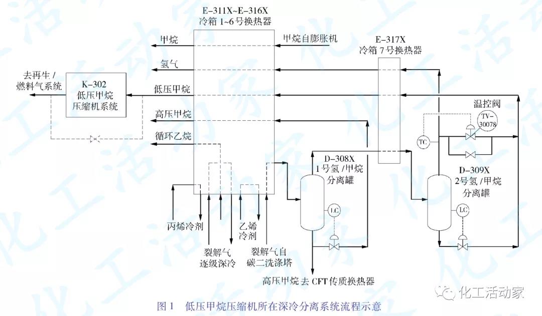 低壓甲烷壓縮機所在深冷分離系統(tǒng)的流程見圖1。