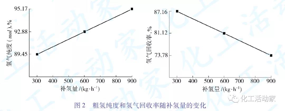 由圖2可知:隨著補氫量的增加,氫氣純度逐漸增大,如要保證氫氣純度(摩爾分?jǐn)?shù))與原設(shè)計一致,仍為95%,補氫量需加大到900kg/h。但增加補氫量會導(dǎo)致氫氣回收率降低,900kg/h的補氫量對應(yīng)的氫氣回收率低至73.78%。乙烯裝置的氫氣產(chǎn)品除用于碳三加氫外,還送汽油加氫裝置以及聚烯烴裝置,多出部分送至煉油廠。氫氣回收率降低將使氫氣產(chǎn)品的外送量減少,這將影響到煉油裝置的用氫量。根據(jù)裝置實際情況,600kg/h補氫量下81.12%的氫氣回收率在可接受的范圍。
