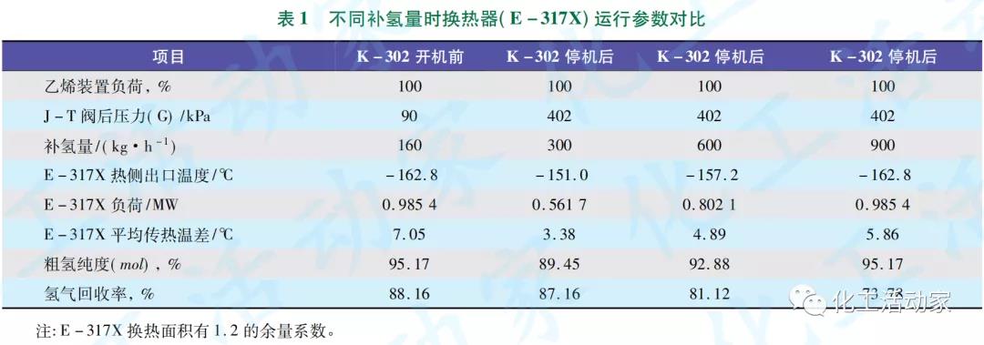 在裝置維持100%負(fù)荷情況下,基于E-317X的實際換熱能力,對K-302停機后不同補氫量時E-317X運行參數(shù)、粗氫純度和氫氣回收率等進(jìn)行模擬計算,結(jié)果見表1。