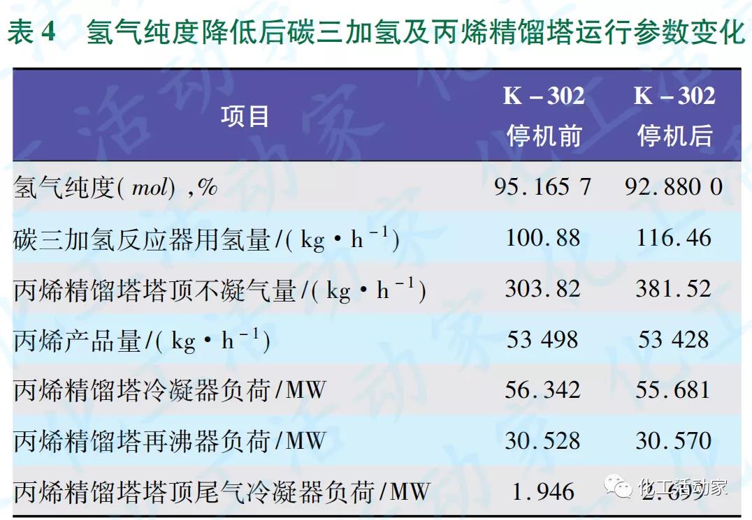 下游聚丙烯裝置的氫氣用量很少,雖然氫氣純度降低,但氫氣產(chǎn)品組分中僅甲烷含量升高,CO、O2等雜質(zhì)含量無變化,因此對反應(yīng)幾乎無影響,僅排放量少許增加,對裝置的正常操作無影響。