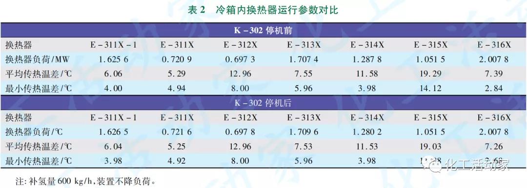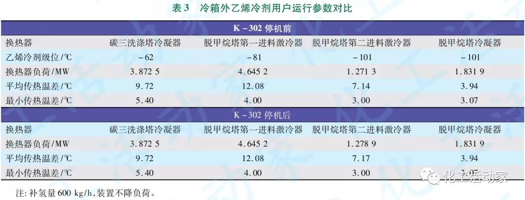 由表2可知:K-302停機后,補氫量增為600kg/h時,冷箱內(nèi)各板翅換熱器的運行參數(shù)變化幅度很小,因此不影響冷箱的正常換熱操作。由表3可知:K-302停機和補氫量的增加對冷箱外乙烯冷劑用戶換熱器的運行參數(shù)也無明顯影響,因此也不會影響到乙烯熱泵制冷系統(tǒng)和丙烯制冷系統(tǒng)的正常運行。