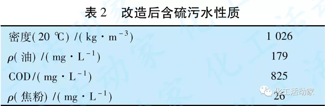 傳統的放空塔系統為間隙性操作,在焦炭塔冷焦過程運行,其他時間則停用。停用后放空塔內物料慢慢冷卻,水蒸氣冷凝并在放空塔底積聚,當放空塔系統再次運行時,因塔底無持續熱源,隨著高溫物料的進入,塔底冷凝水突沸,引起塔底泵抽空,塔頂回流中斷。高溫油氣攜帶大量污油、焦粉沖出塔頂,造成塔頂空冷器易堵塞,冷卻效果差,以及塔頂回流罐污水含油率高、污水攜帶焦粉、乳化嚴重等問題,油水分離效果變差。放空塔頂污水硫質量濃度化驗分析一般在400~2000mg/L,污水性質見表1。
