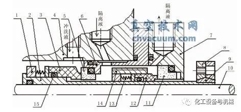 1-彈簧盒組件;2-軸套;3-動(dòng)環(huán)Ⅰ;4-泵端蓋;5-靜環(huán)Ⅰ;6-靜環(huán)座;7-壓蓋;8-傳動(dòng)環(huán);9-轉(zhuǎn)動(dòng)圈;10-泵軸;11-靜環(huán)Ⅱ;12-動(dòng)環(huán)Ⅱ;13-彈簧;14-泵送環(huán);15-O 形圈
